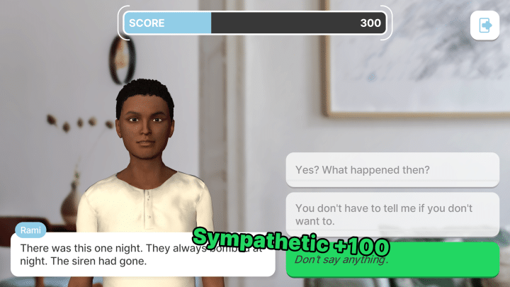 In Helping Hand the player helps a friend to master emotional challenges, such as fear of giving presentations, dealing with criticism, suicidal thoughts and bad memories.